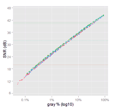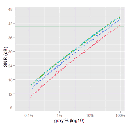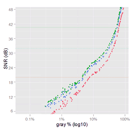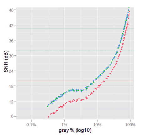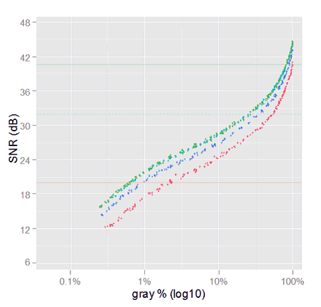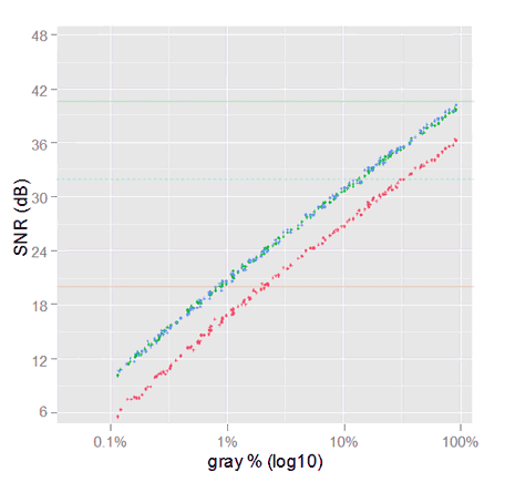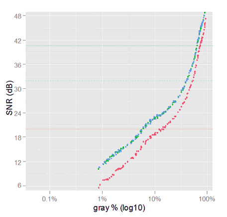We must keep in mind, those quality limits are "officially" for the noise at 18% gray in a linear space, even when for practical reasons we will draw those reference lines along the the width of SNR plots for all the gray levels and even for data in non-linear spaces.